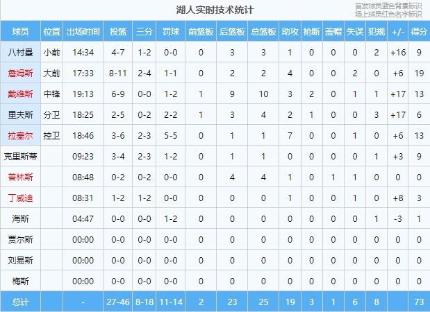 上半场,湖人进攻端表现出色,全队合计46投27中,命中率高达58.7%,三分18投8中,命中率也有44.4%。