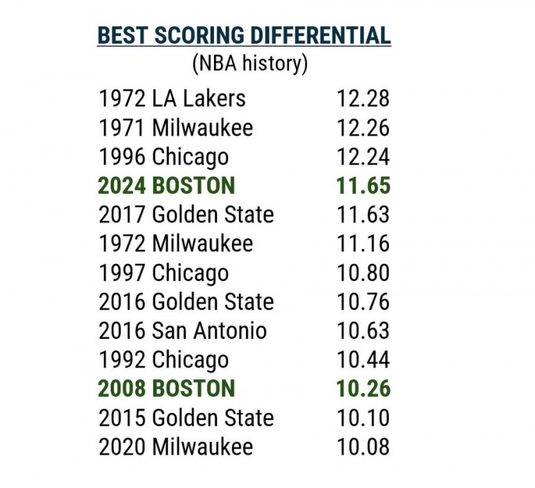 据统计,绿军本赛季场均赢对手多达11.65分,排名历史第4,仅次于1972年湖人(12.28分)、1971年雄鹿(12.26分)、1996年公牛(12.24分)。