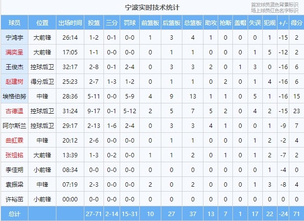 本场比赛,宁波罚球线上表现不佳,全队罚球合计31罚15中,命中率仅有48.4%。外援埃格伯努罚球9中5竟是全队罚球命中率最高。
