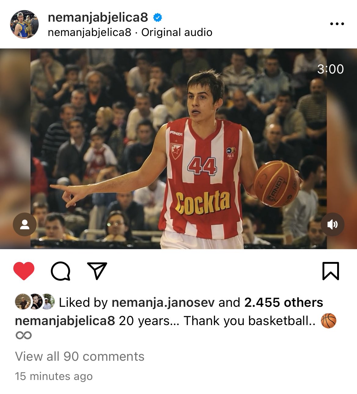 03月24日讯 2022年金州勇士冠军成员、35岁的别利察今日社媒自宣退役,结束20年篮球生涯。