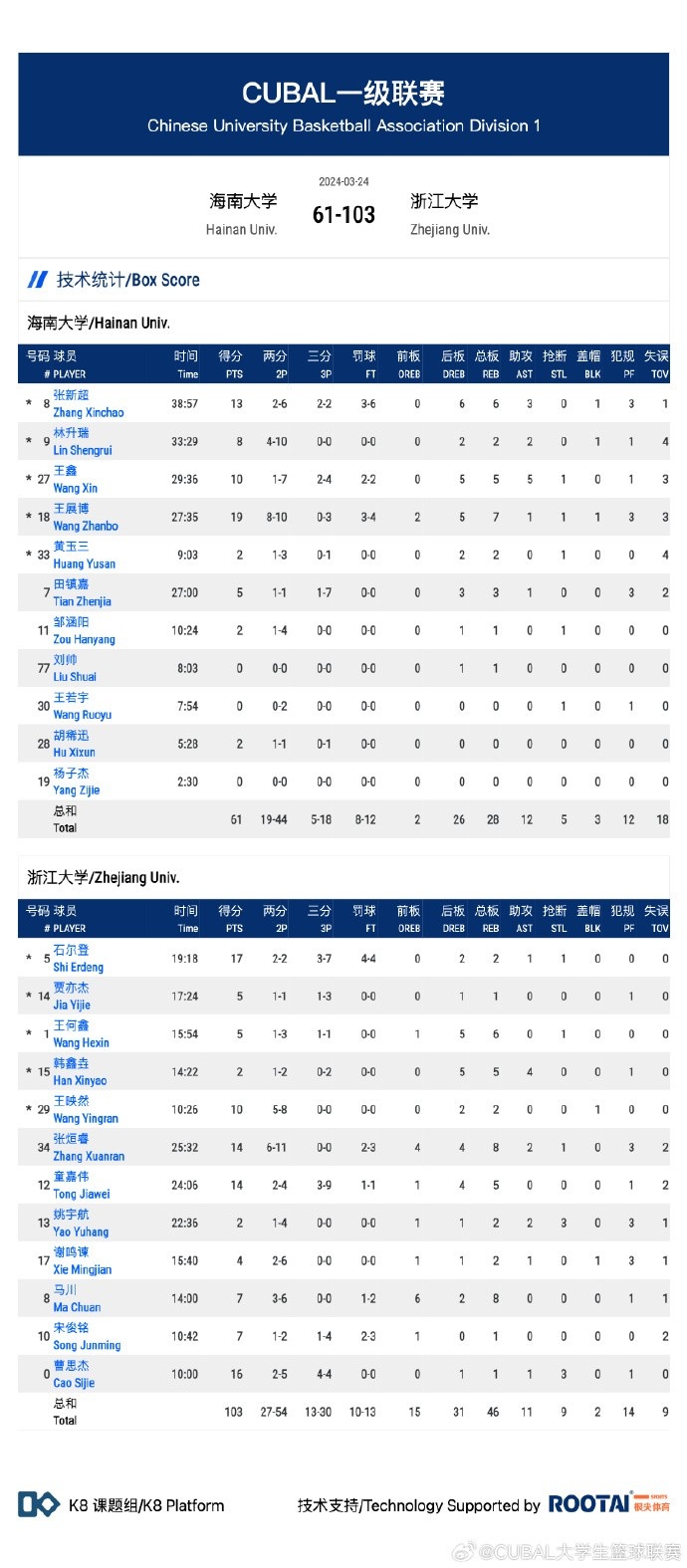 末节开局海南大学依靠林升瑞和王展博的连续拿分抢开局,浙大这边手握大比分领先没有太大压力,随着姚宇航也拿下2分,浙大12人登场全部有得分入账,双方也以练兵形式打完第四节比赛。最终,浙江大学103-61击败海南大学拿下比赛。