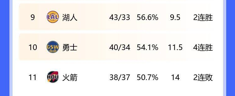 火箭11连胜后遭遇两连败,战绩来到38胜37负,继续排在西区第11,和第10的勇士胜场差拉大到2.5个。