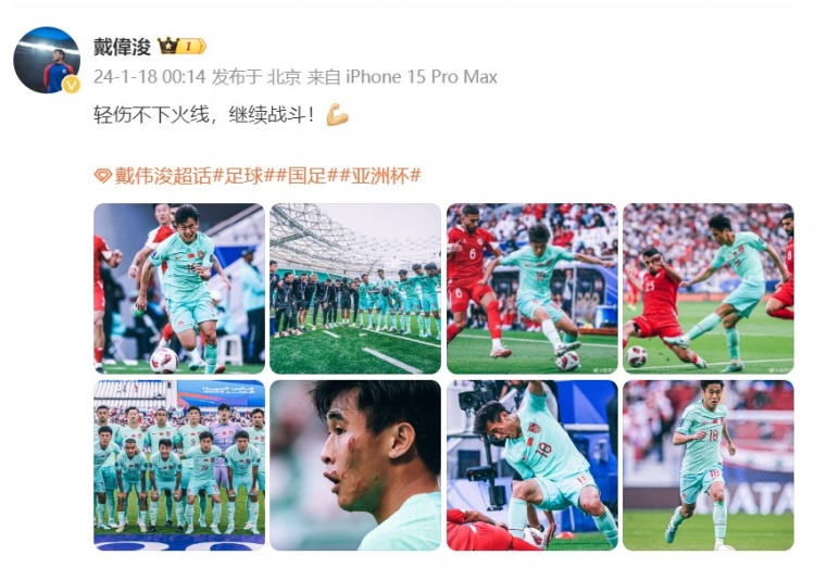 1月18日讯 亚洲杯小组赛第二轮,国足0-0战平黎巴嫩,两场比赛拿到2分。赛后,国脚戴伟浚发文鼓励球队。戴伟浚在个人微博中写道:轻伤不下火线,继续战斗!与黎巴嫩一...