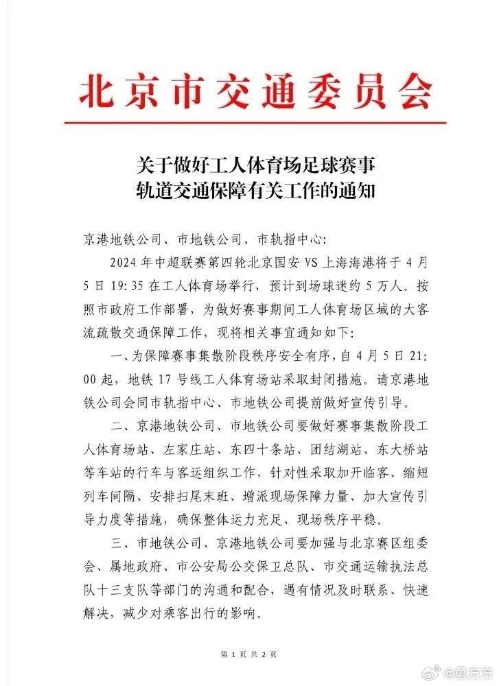 北京市交通委员会发布了《关于做好工人体育场足球赛事轨道交通保障有关工作的通知》,通知中称国安vs海港将于4月5日19:35在工人体育场举行,预计到场球迷约5万人,为做好大客流疏散交通保障工作,自4月5日21:00起,地图17号线工体站采取封闭措施,京港地铁公司、市地铁公司要做好赛事集散阶段工人体育场站、左家庄站、东四十条站、团结湖站、东大桥站等车站的行车与客运组织工作,针对性采取加开临客、缩短列车间隔、安排扫尾末班、增派现场保障力量、加大宣传引导力度等措施,确保整体运力充足、现场秩序平稳。