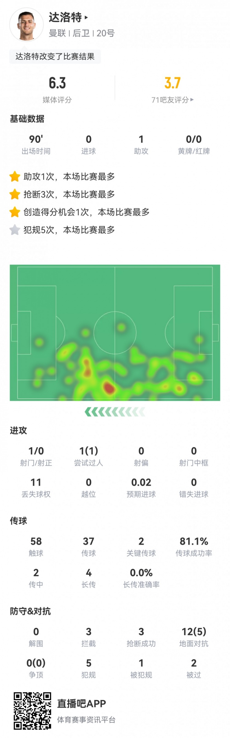 4月5日讯 本轮英超,切尔西4-3读秒绝杀曼联。补时阶段达洛特送点,球员全场重点数据如下↓