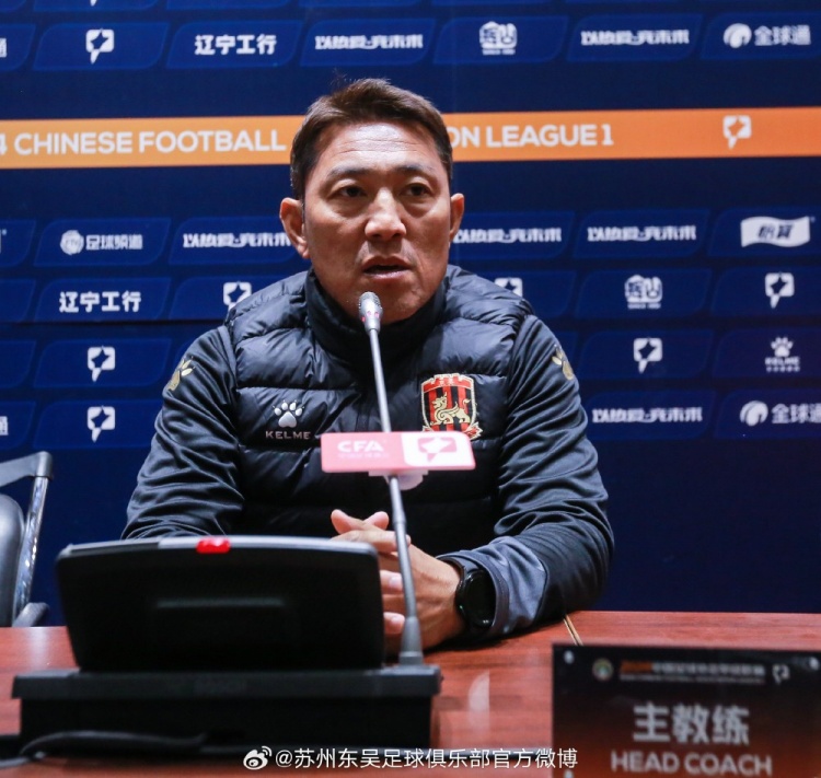 4月5日下午14:50,中甲第5轮第38场苏州东吴队赛前新闻发布会在沈阳奥体中心召开,主教练金大仪携队员黄嘉俊出席。