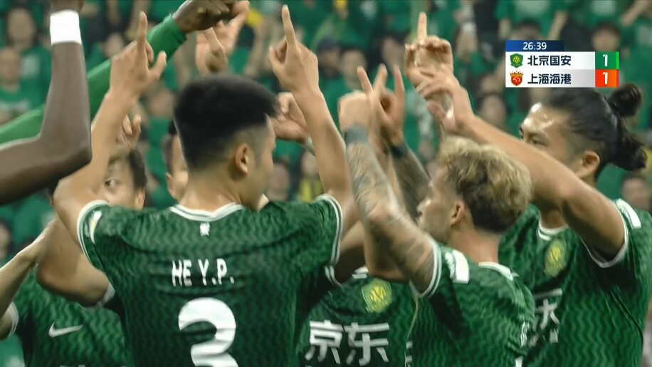 04月05日讯 国安vs海港第26分钟,古加弧顶远射破门1-1扳平比分。进球后,国安全队食指指天,悼念不久前去世的国安球迷杨雪。