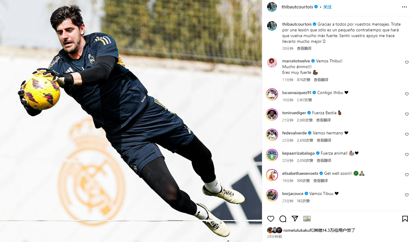 库尔图瓦在社媒晒出自己训练中的照片,感谢了大家的祝福:“谢谢大家的留言。为受伤感到难过,但这不过是个小小的挫折,它将让他归来时更加强大。感受到你们的支持让我能更好应对(伤病)”