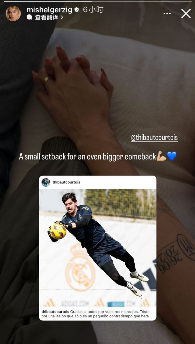 去年8月,库尔图瓦就在训练照左膝前十字韧带撕裂,在接近复出时,球员再次遭遇重创。库尔图瓦的妻子米谢尔也更新社媒,晒出两人十指相扣的照片,为球员加油打气:只是一次小挫折,等你回归时会更加强大!