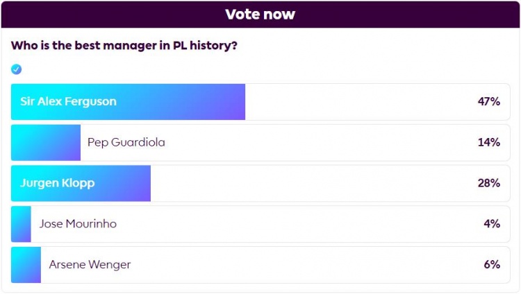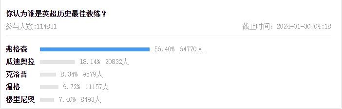 不过,弗温穆渣瓜位列前五没有争议。今年1月,英超官方就以五位主帅为候选发起英超历史最佳教练的投票,弗格森以47%的得票率遥遥领先,其次是克洛普(28%)、瓜迪奥拉(14%)、温格(6%)、穆里尼奥(4%)。而发起的投票里,弗格森以56%的得票率独占鳌头,其次是瓜迪奥拉(18%)、温格(10%)、克洛普(8%)、穆里尼奥(7%)。