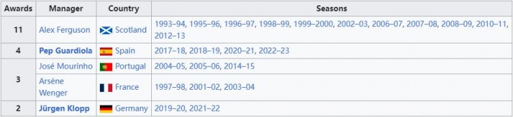 英超赛季最佳教练评选,弗格森11次,瓜迪奥拉4次,穆帅与温格3次,克洛普2次,仅此五绝不止一次获奖。