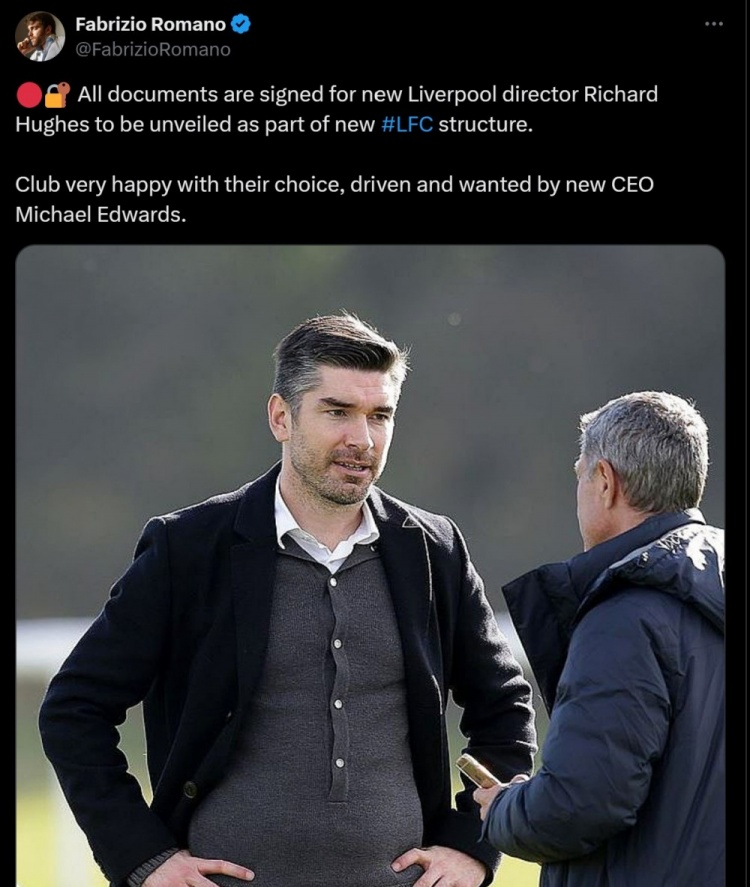 罗马诺透露,俱乐部新CEO爱德华兹非常青睐休斯,也是他推动俱乐部聘请对方出任新总监的,利物浦也非常满意这个人选。