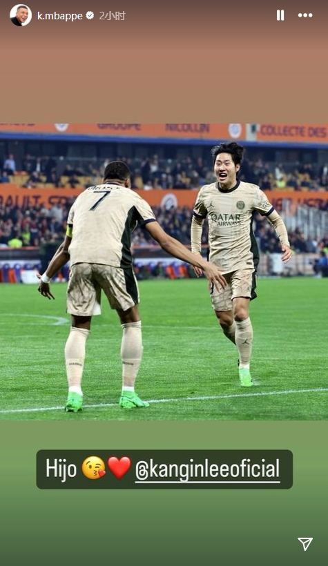 姆巴佩晒出李刚仁世界波破门后与自己拥抱庆祝的瞬间,并配文:“伙计!爱你!”
