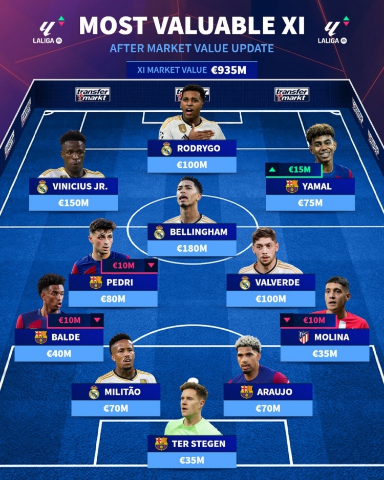 前锋:维尼修斯(皇马,1.5亿欧),罗德里戈(皇马,1亿欧),亚马尔(巴萨,7500万欧)