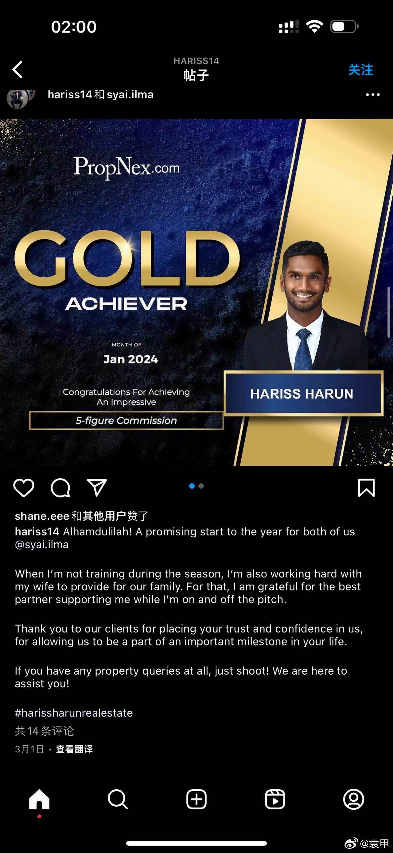 03月22日讯 解说员、评论员袁甲发博,称据他的朋友了解,新加坡国家队队长哈里斯-哈伦不仅踢球,还有兼职工作。