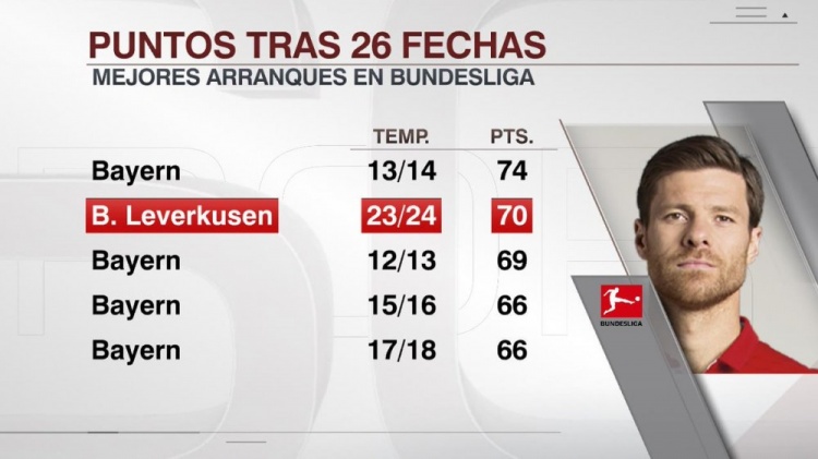 据ESPN统计,勒沃库森本赛季前26轮德甲比赛拿到70分,这是德甲历史同期第二高积分,仅次于2013-2014赛季拜仁的74分。