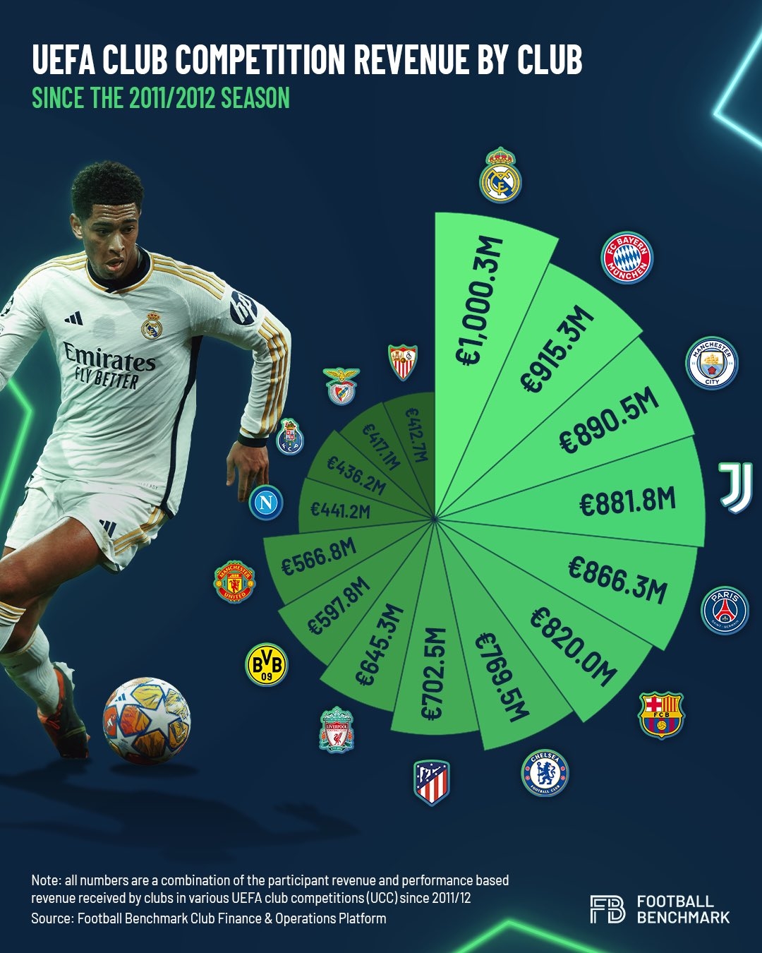 03月24日讯 足球数据分析网站Football Benchmark统计了自2011/12赛季以来,参加欧足联赛事获得收入最多的俱乐部,皇马以10.003亿欧元排名第1。