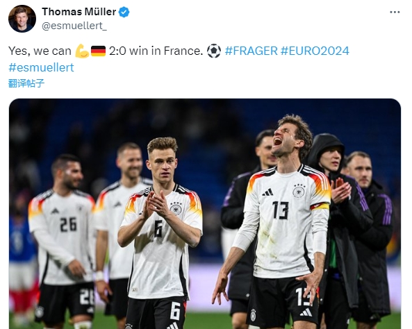 穆勒在社交媒体上晒出赛后谢场的照片,并写道:“是的,我们可以(做到),2-0客胜法国。”