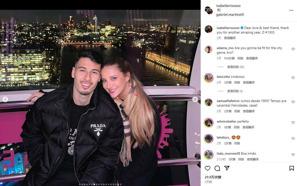 马丁内里在ins晒出过去一年和女友的甜蜜合影大秀恩爱,马丁内利还配文道:“亲爱的爱人和最好的朋友,谢谢你一起走过美妙的又一年。”
