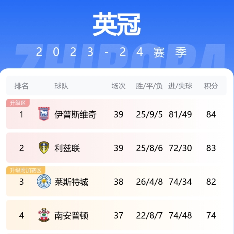 英冠争冠三强分差2分:伊普斯维奇84分,利兹联83分,莱斯特城82分