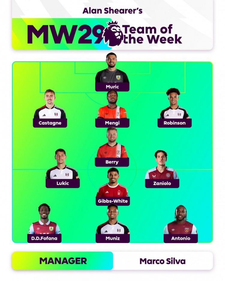 中场:卢基奇(富勒姆)、卢克-贝里(卢顿)、扎尼奥洛(阿斯顿维拉)、吉布斯-怀特(诺丁汉森林)