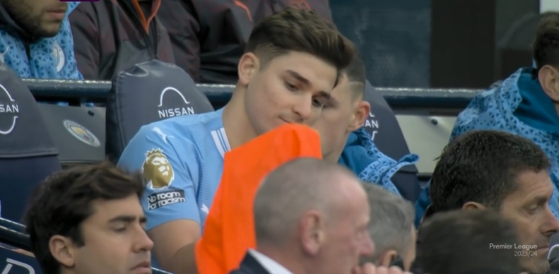 第88分钟,瓜迪奥拉和场边交流了一番,哈兰德问题不大,替补席的阿尔瓦雷斯也穿回了背心。