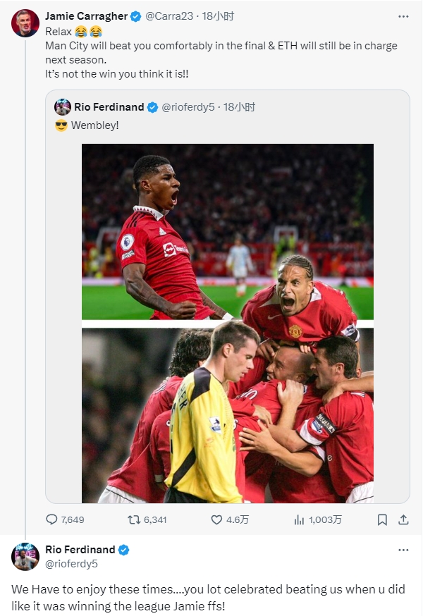 03月18日讯 足总杯1/4决赛,曼联4-3战胜利物浦晋级。费迪南德更新社媒庆祝曼联晋级,卡拉格却在动态下评论:别激动,曼城会在决赛中轻松赢下你们,而滕哈赫下赛季也会继续执教。这不是你想的胜利。