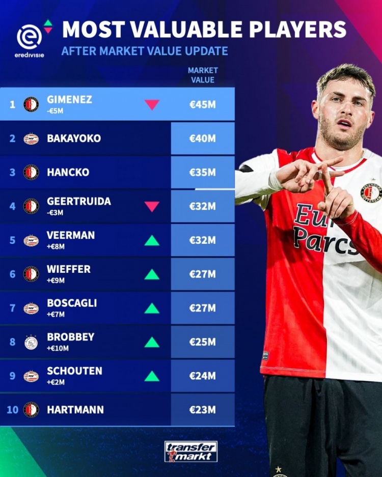 3月19日讯 今日德转市场更新了荷甲球员身价,列出了荷甲身价排名前十的球员。