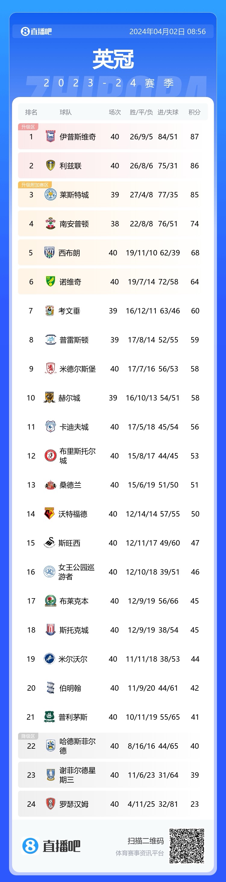 04月02日讯 英冠第40轮,升班马伊普斯维奇3-2绝杀南安普顿,登顶英冠榜首。