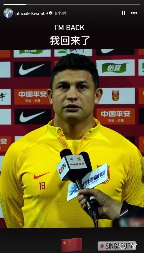 在抵达新加坡后,艾克森更新了社媒,晒出一张身穿国家队球衣的照片,定位显示他已随国足抵达新加坡,他用中英双语写道:“我回来了。”