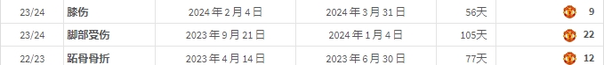 利马至曼联后伤病史(最新将伤缺至少一月还未统计)↓