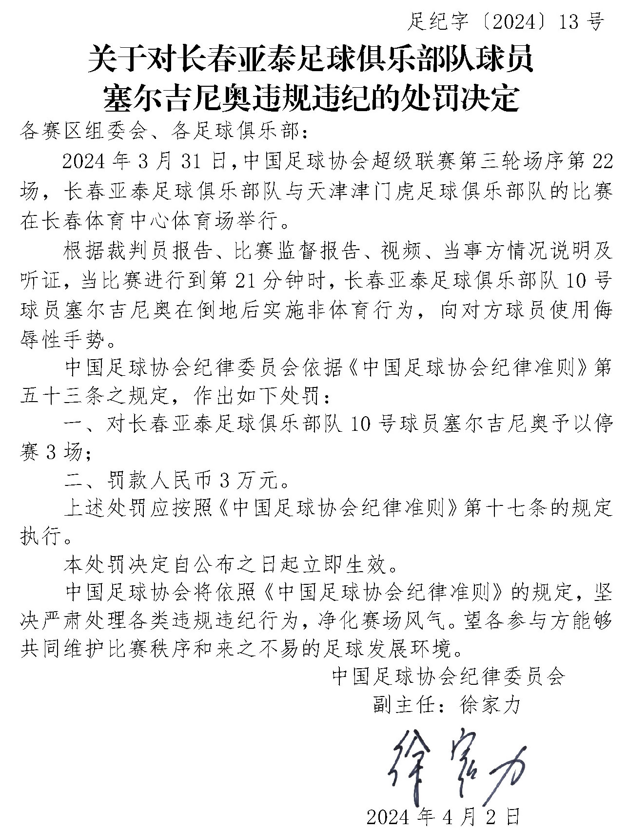 04月03日讯 足协官方发布罚单,长春亚泰外援塞尔吉尼奥因侮辱性手势,停赛3场+罚款3万。