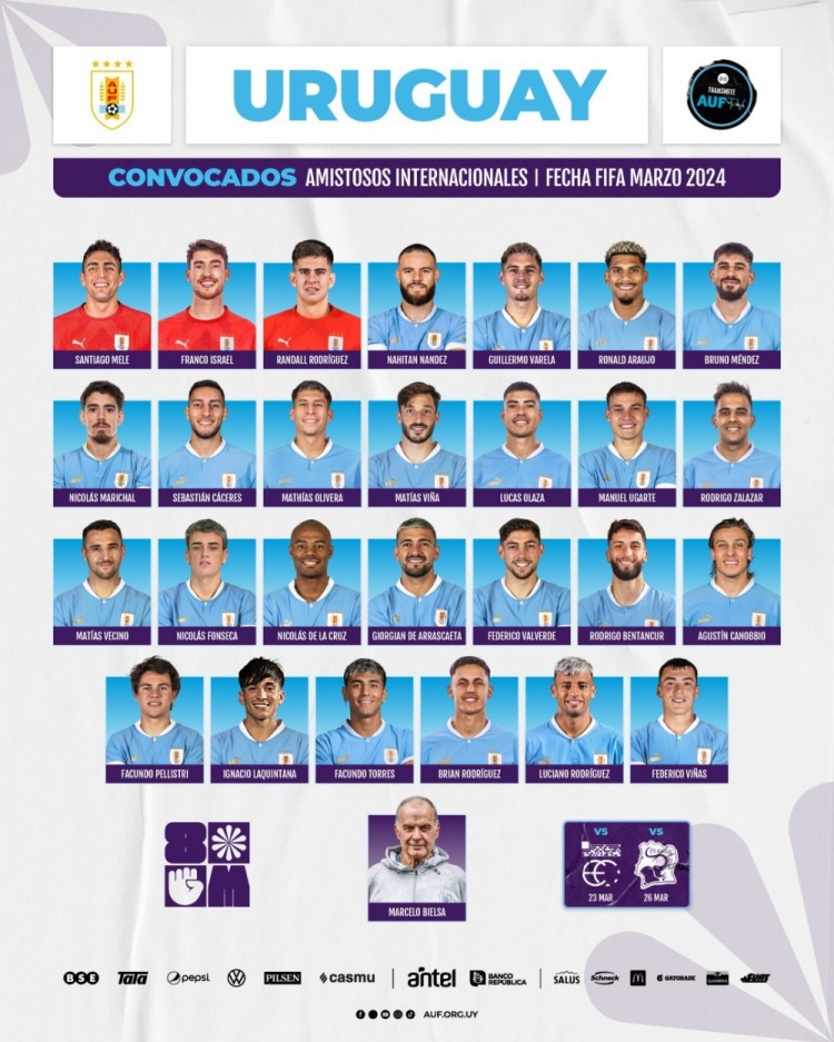 3月19日讯 乌拉圭国家队公布了新一期大名单,苏亚雷斯落选,努涅斯伤缺,巴尔韦德、阿劳霍、本坦库尔、乌加特在列。