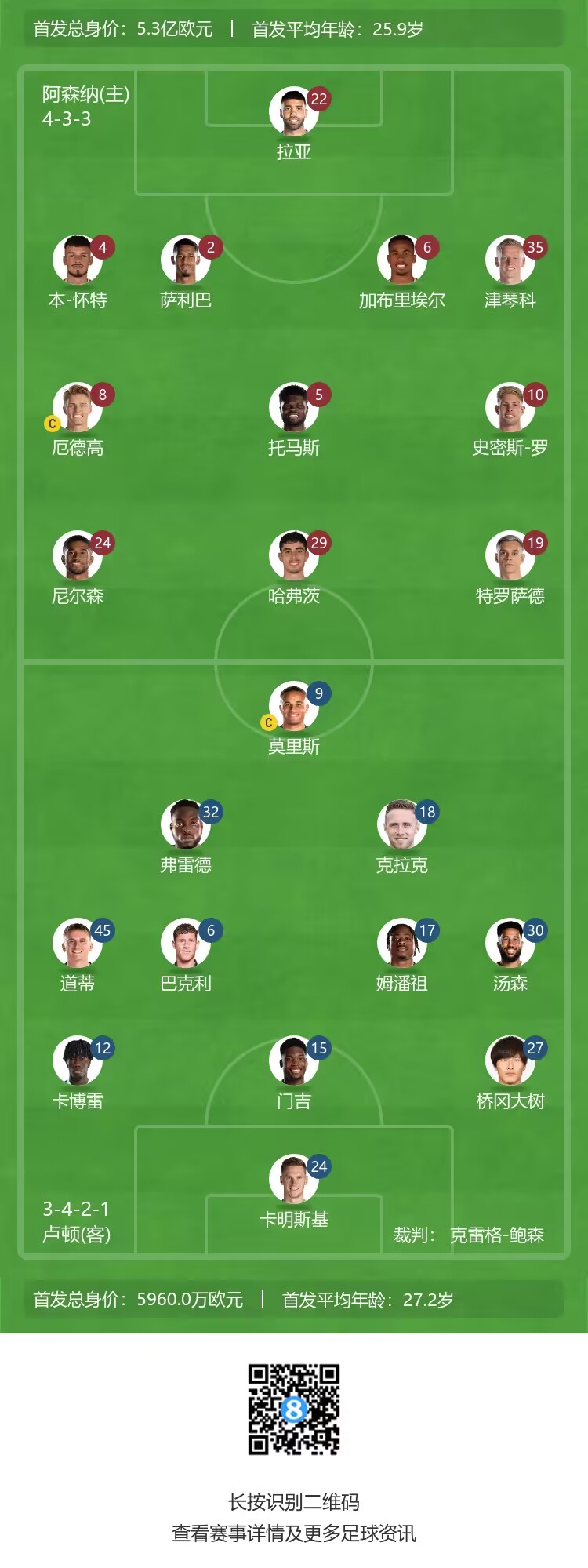 阿森纳首发:22-拉亚、4-本-怀特、2-萨利巴、6-加布里埃尔、35-津琴科、5-托马斯、8-厄德高、10-史密斯-罗、24-尼尔森、19-特罗萨德、29-哈弗茨