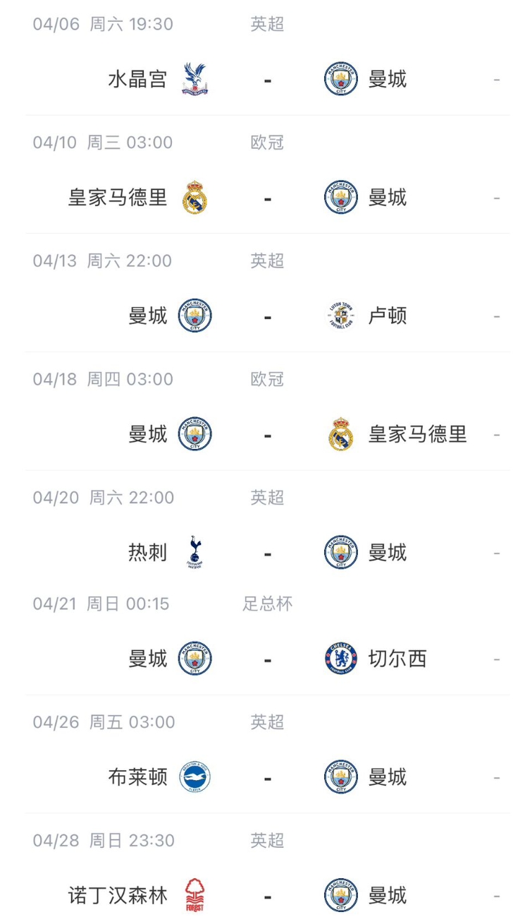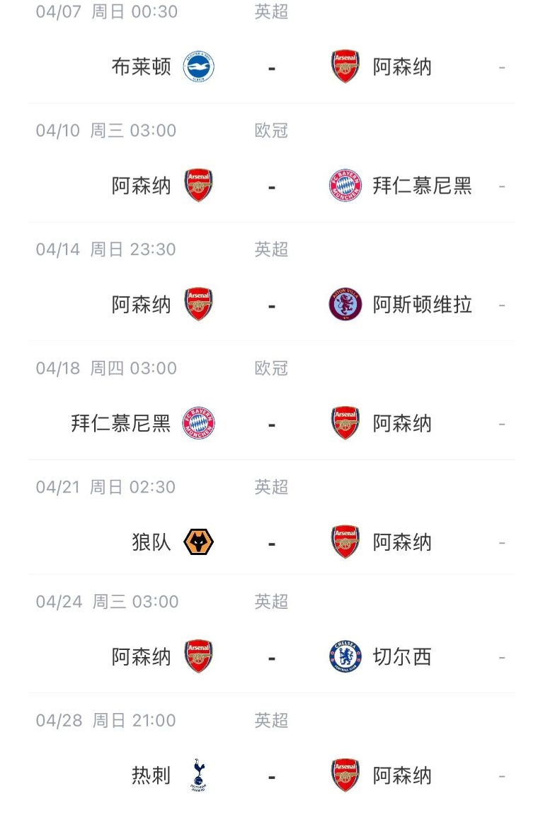 阿森纳和曼城,四月英超争冠途中将战热刺、切尔西,还要在欧冠淘汰赛分别对阵拜仁、皇马!