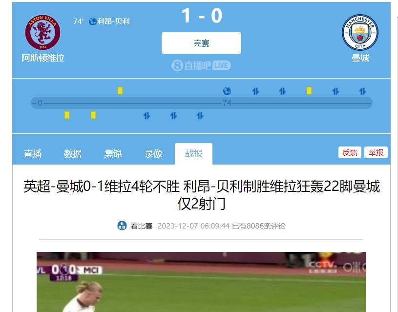 上半程曼城0-1维拉,曼城打门仅2次,被维拉狂射22脚。