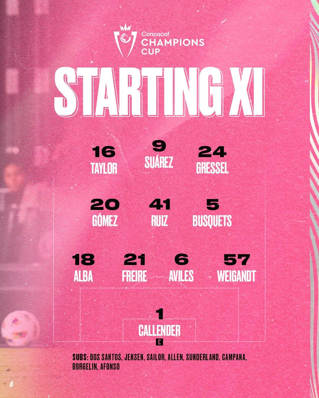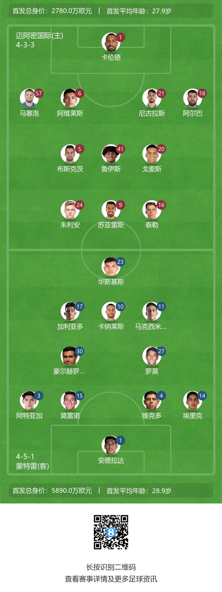 迈阿密国际首发:1-卡伦德、18-阿尔巴、21-弗莱雷、6-阿维莱斯、57-魏格特、20-迭戈-戈麦斯、41-鲁伊斯、5-布斯克茨、16-泰勒、24-格雷塞尔、9-苏亚雷斯