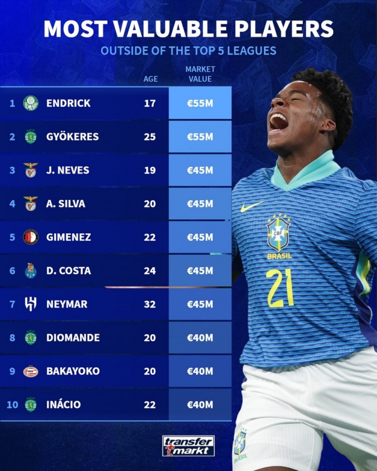 4月4日讯 德国转会市场列出了非五大联赛球员身价榜单,帕尔梅拉斯前锋恩德里克、葡萄牙体育前锋吉奥克雷斯以5500万欧并列居首。