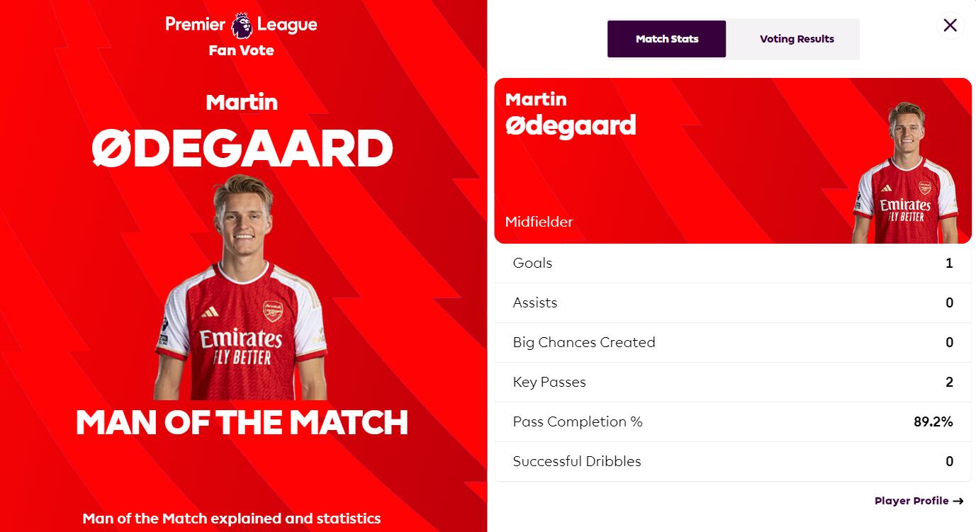 厄德高本场比赛打进一球,2次关键传球,传球成功率89.2%,赛后他也当选英超官方评选出的本场比赛全场最佳球员。