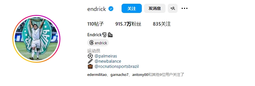 恩德里克ins在3月涨粉155.6万,在整个ins平台,仅次于C罗。C罗ins在3月涨粉350万。