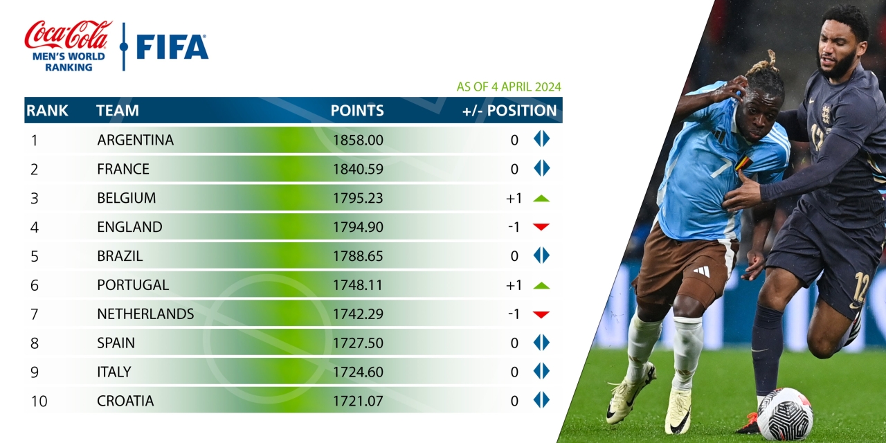 04月04日讯 FIFA官方今日公布国家队的世界排名,在新一期的世界排名中,阿根廷不变依旧排在第一,英格兰下降1位,葡萄牙上升1位。