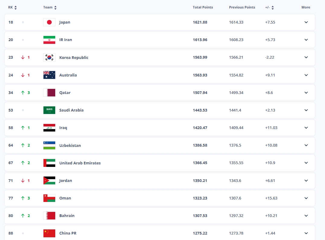 亚洲国家队最新排名: