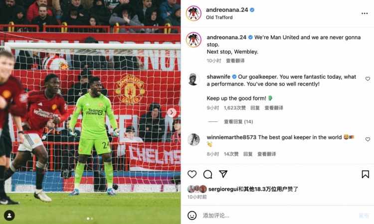 3月18日讯 曼联在足总杯四分之一决赛击败利物浦晋级,赛后曼联门将奥纳纳更新社交媒体庆祝胜利。