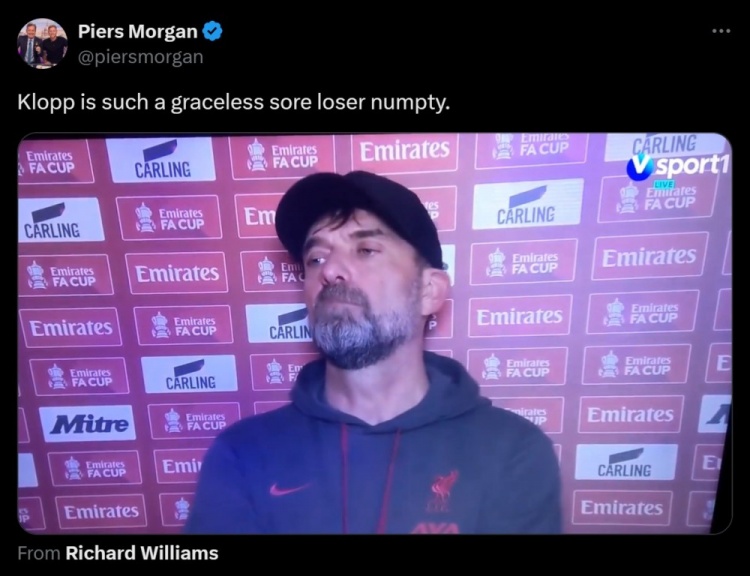 3月18日讯 足总杯1/4决赛,利物浦客场3-4遭到曼联绝杀。赛后采访中,克洛普被Scandinavian TV的记者惹怒,怒怼对方“身体状态不好”后愤然离场。针对克洛普的行为,英国名嘴、知名阿森纳球迷皮尔斯-摩根也在社交媒体上表达了不满。