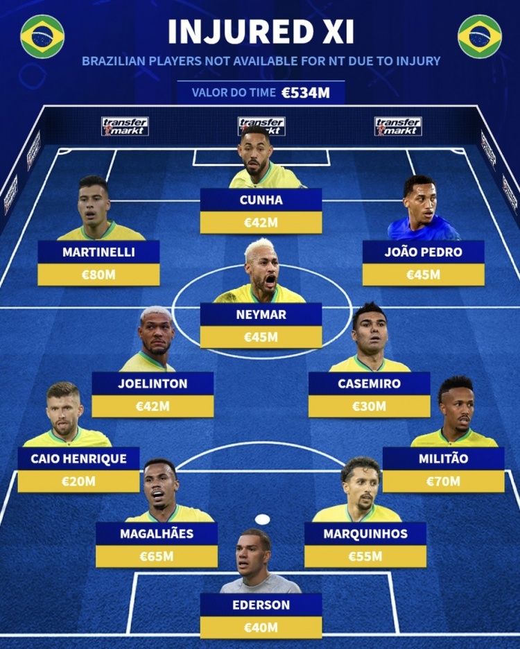 3月20日讯 德转列出了巴西国家队本期集训伤缺名单,内马尔&卡塞米罗领衔,11人总身价高达5.34亿欧。