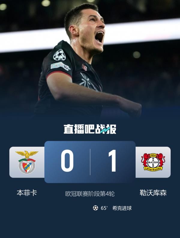 希克破门,本菲卡0-1不敌勒沃库森,遭遇欧冠4连败。