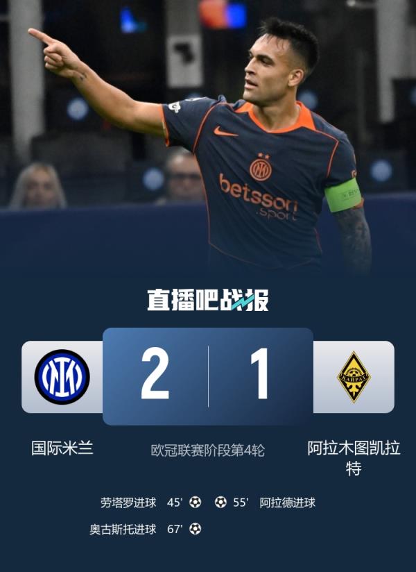 欧冠4轮全胜!国米2-1阿拉木图凯拉特 劳塔罗破门奥古斯托贴地斩