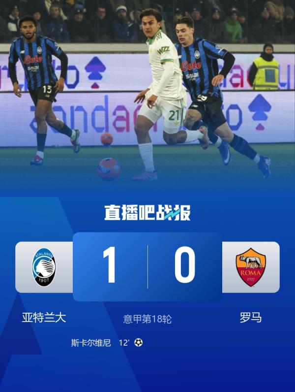意甲第18轮,亚特兰大1-0战胜罗马,斯卡尔维尼制胜。
