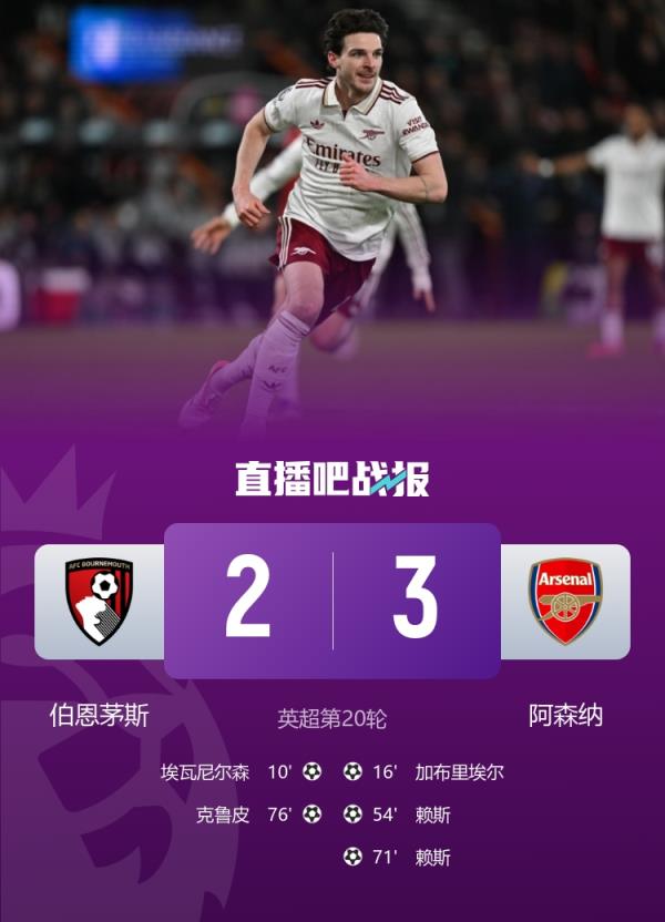 英超联赛第20轮,阿森纳3-2逆转伯恩茅斯,赖斯梅开二度,加布里埃尔进球。