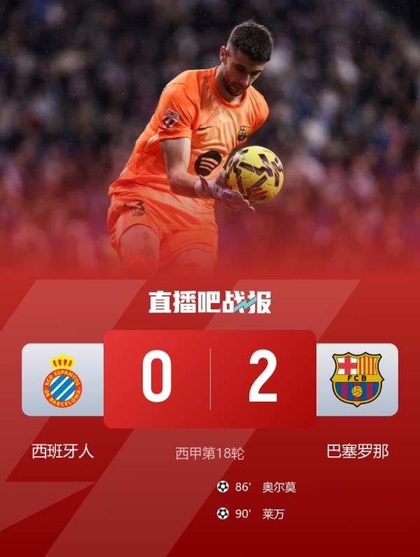 西甲联赛第18轮,巴塞罗那客场2-0战胜西班牙人,霍安··加西亚屡献神扑,奥尔莫、莱万进球。